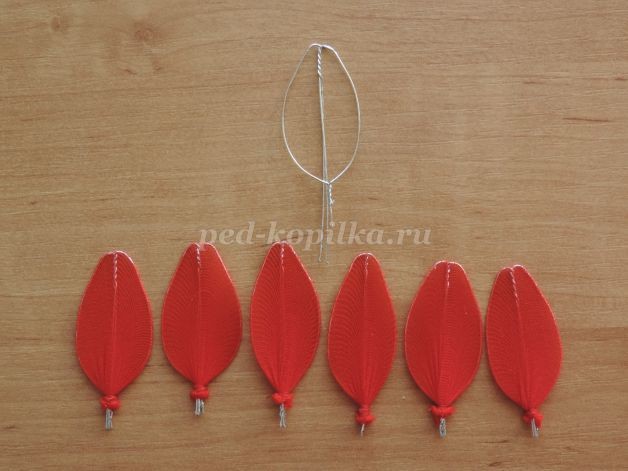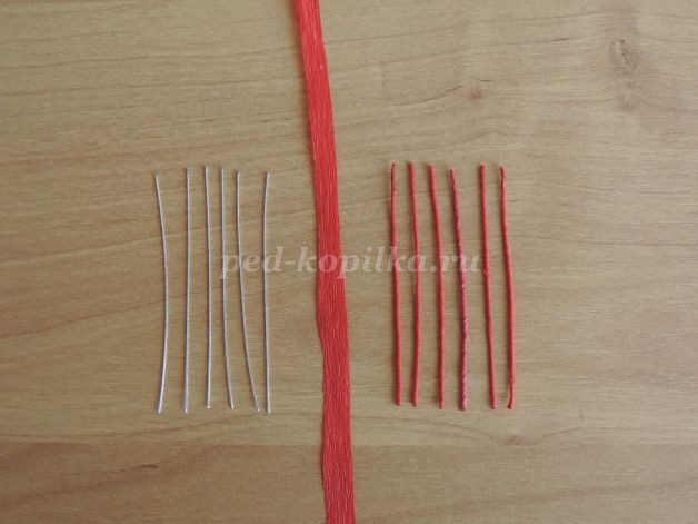 4. Переходим к изготовлению пестика и тычинок.Отмерить 6 проволочек одинакового размера и обмотать их красной креповой бумагой.