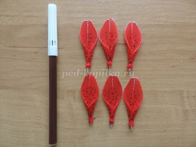 3. С помощью фломастера ставим крапинки и сгибаем у нижней части лепестков проволоку к центру.