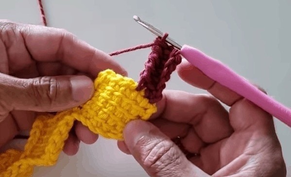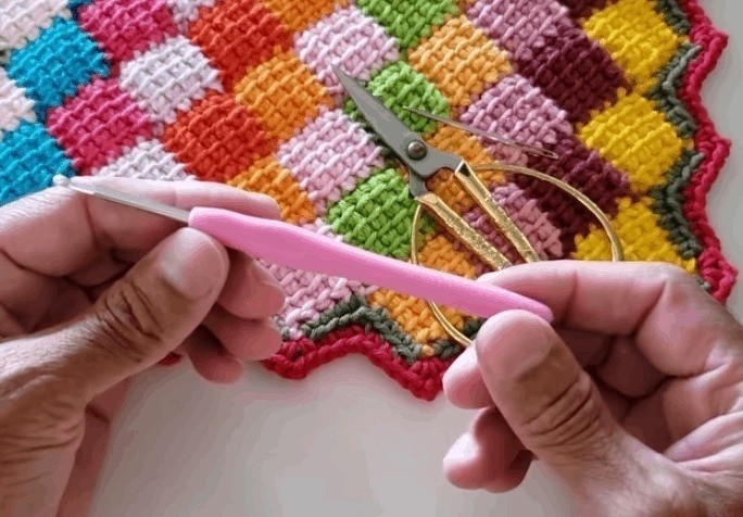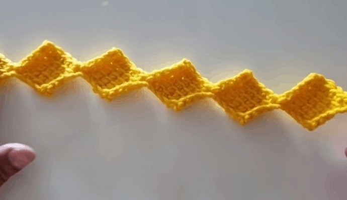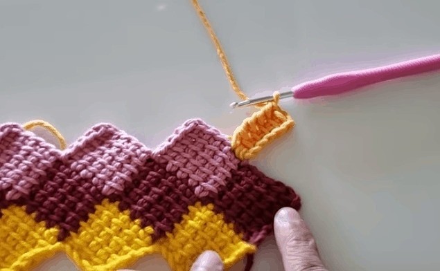 Очень интересный узор крючкомМожно вязать из разноцветных остатков пряжи или из пряжи с градиентным переходом цвета.