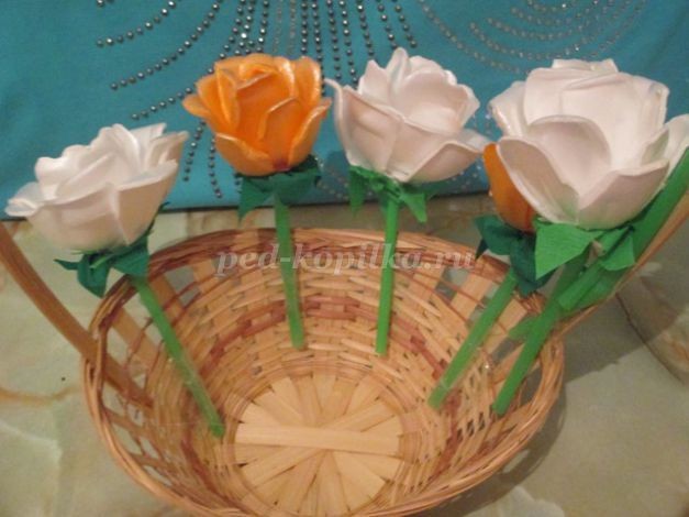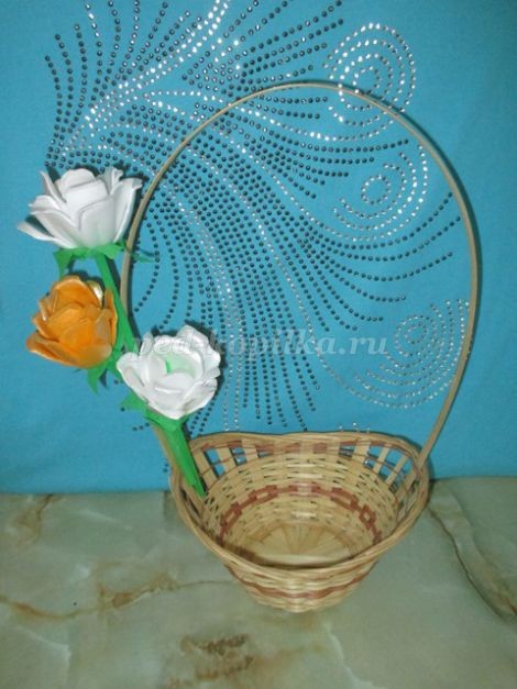 4. Теперь по всей окружности корзинки скотчем прикрепляем белые и желтые розы (можно приклеить клеем).