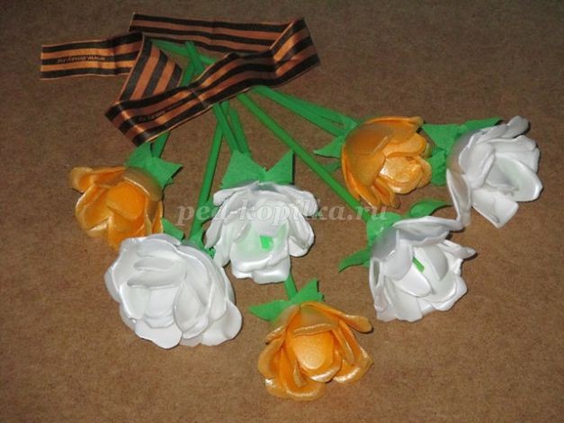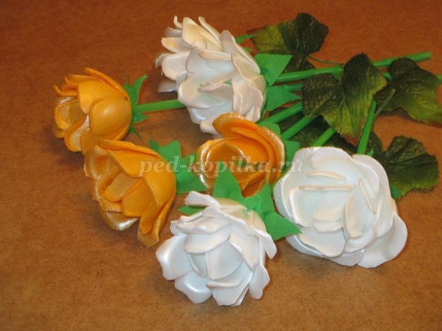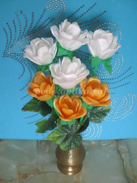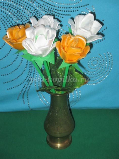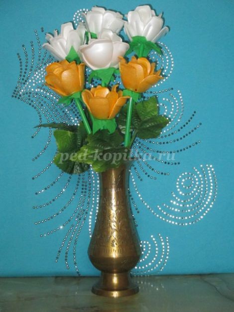Собираем букет в вазе, добавляем искусственные или сделанные самостоятельно листочки розы.