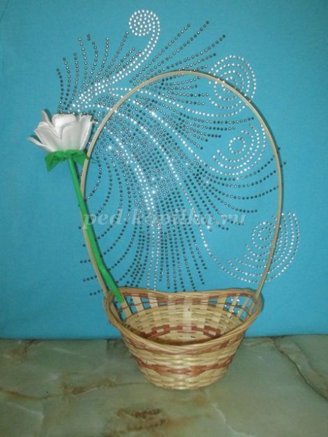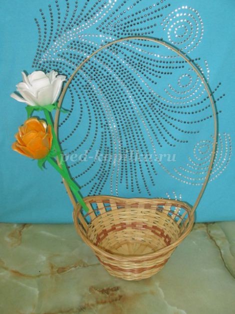 1. Берем цветок на стебле и прикрепляем его скотчем к ручке корзинки. Можно приклеивать клеем.