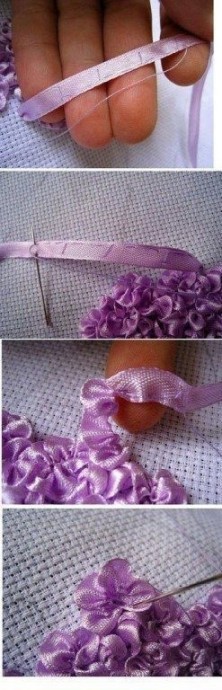 Цветы из атласных лентСложные завитки каждого лепестка отличают эти цветочки от других и делают их еще прелестнее.