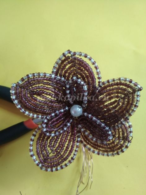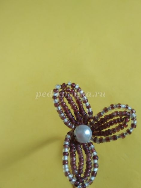Длинненькие лепестки плетутся точно так, как и кругленькие, только основание не 5 бисеринок, а.10.Таких лепестков понадобится 3 штуки.