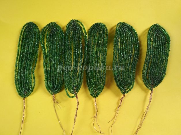Теперь приступаем к изготовлению листочков.Возьмите проволоку длиной 70 сантиметров и загните один конец. На рабочий конец проволоки наберите 70 бисеринок и внизу сделайте петельку.