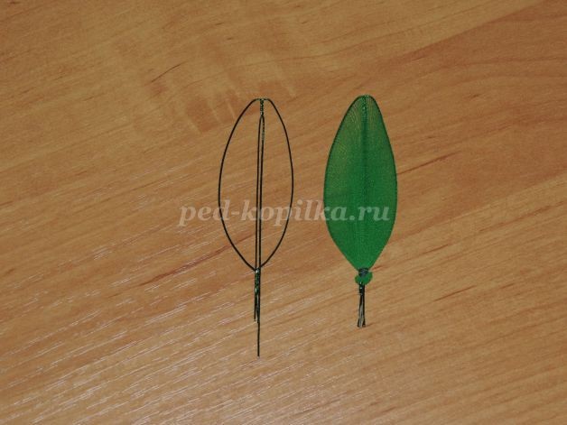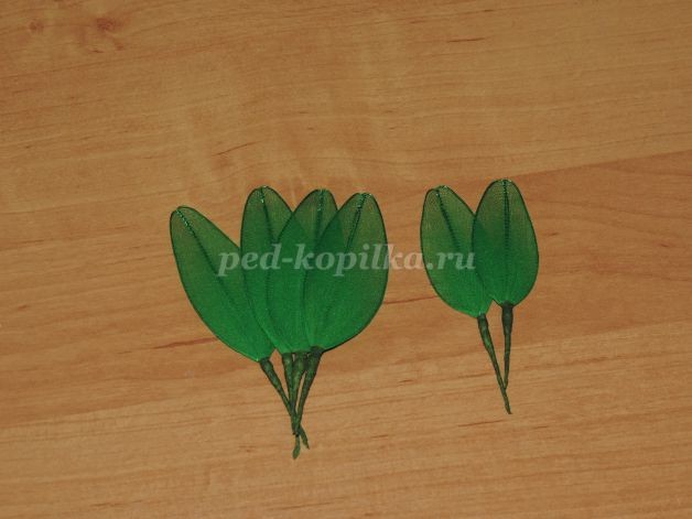 Растянуть проволоку в виде листочка и обтянуть капроном как в предыдущих этапах. Обмотать тейп-лентой стебельки.