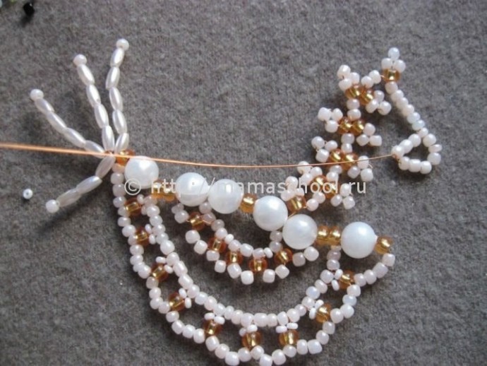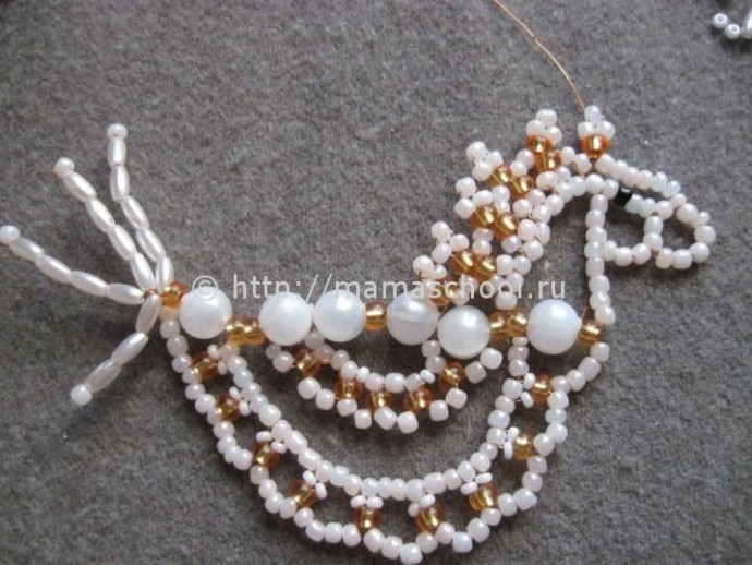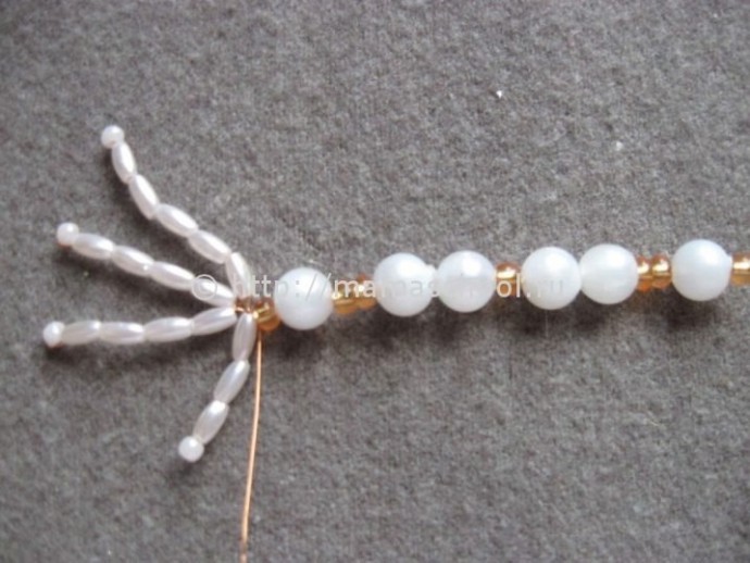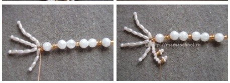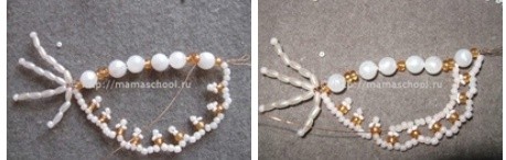 Надеть 4 бисерины, 1 бусину и 3 бисеринки, продеть проволоку в бусину. Все это повторить 7 – 9 раз (это зависит от размера бусин, которые набирали в самом начале работы). Завершают ряд 4 бисерины, после чего продеть проволоку через 2 бусины, которые надевали в самом начале работы.