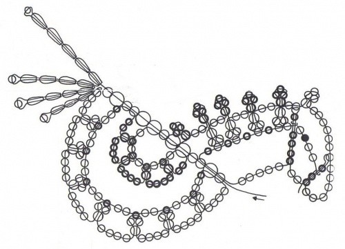 Далее необходимо закрепить ряд: для этого по 2 бисерины между кончиками, получается двойная дуга, с узором.Закрепляем ряд, продеваем через две маленькие бусины и делаем внутренние дуги по схеме. Аналогичным методом, по схеме делаем еще дугу внутри. Грива. Набрать 1 бусину и 3 бисерины, продеть проволоку через бусину. Далее по схеме плетен гриву. После чего набрать 16 бисерин, продеть в 10, счет в обратном направлении, затянуть и продеть через три предыдущие бисеринки.Набрать три бисерины, закрепить через верхнюю часть гривы, сделать ряд с глазом, вернуться по этому ряду обратно, предварительно закрепить проволоку. Вернуться к нижней части гривы, закрепить ряд — гриву по схеме, через бусины туловища пропустить проволоку набрать 5 бисеринок – это шея и закрепить с головой. Спрятать концы проволоки и ваша лошадка готова.