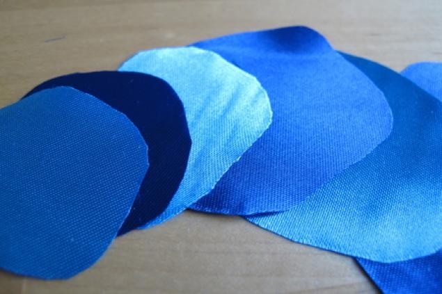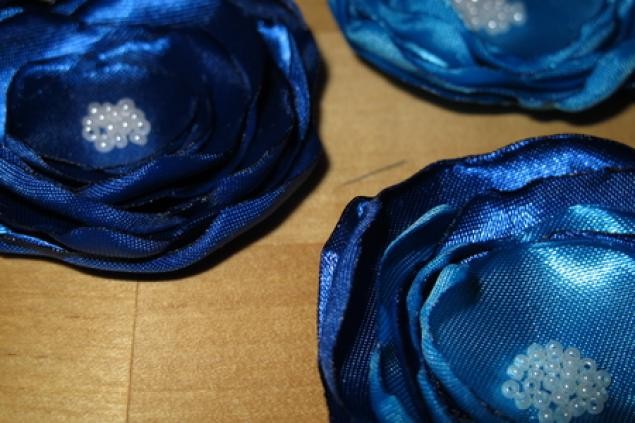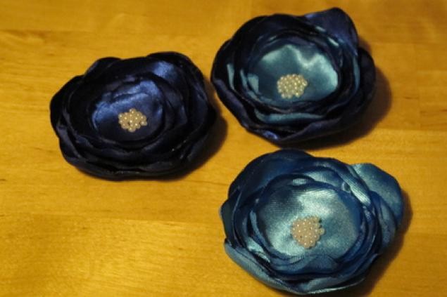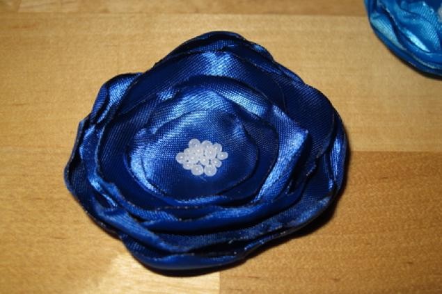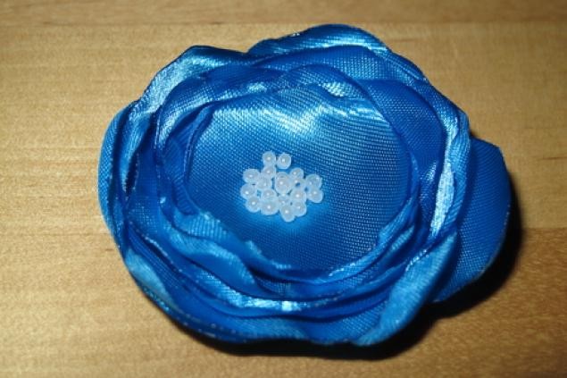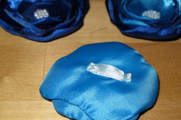 К последнему лепестку пришиваю кусочек атласной ленты, чтобы цветок было удобно крепить.