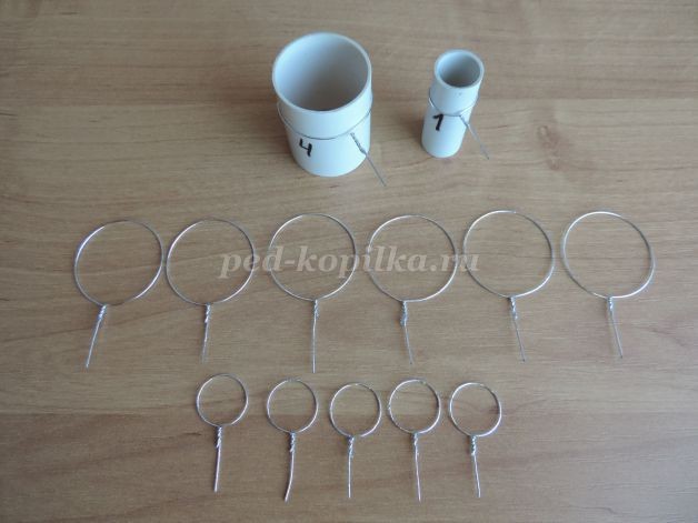 1. Проволоку для цветов наматываем вокруг шаблонов №4 и №1. Закрутить при помощи плоскогубцев. Оставить примерно 2см проволоки. Для одного цветка нам понадобится 6 больших и 5 маленьких заготовок.