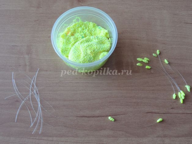 4. Теперь делаем тычинки. Нарезать толстую леску длиной 6-7 см. Из шарикового пластилина сформировать шарики и закрепить с двух сторон на кончик лески. Обязательно дать засохнуть пластилину.