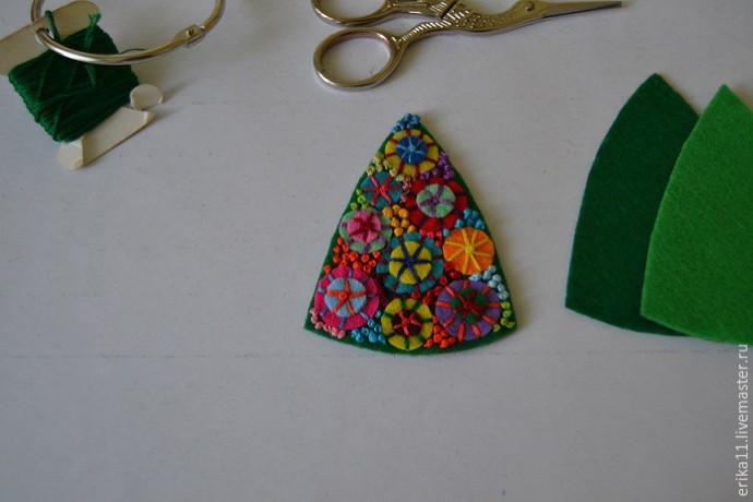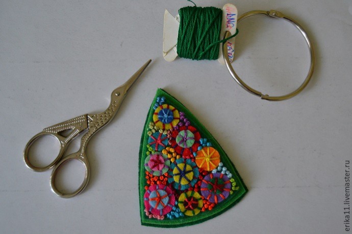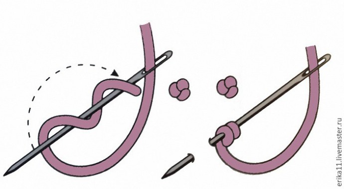 6. Брошка обшита нитками мулине, и для того чтобы придать ей больше насыщенности и яркости, я решила украсить ее еще и французскими узелками. Я очень люблю украшать изделия из фетра такими узелками, на мой взгляд, это отличное дополнение к вышивке. Вот смотришьна вещь, и кажется, что чего-то не хватает, но стоит добавить французские узелки, и вещь играет в руках (для тех, кто еще не владеет техникой французского стежка выставляю схему).