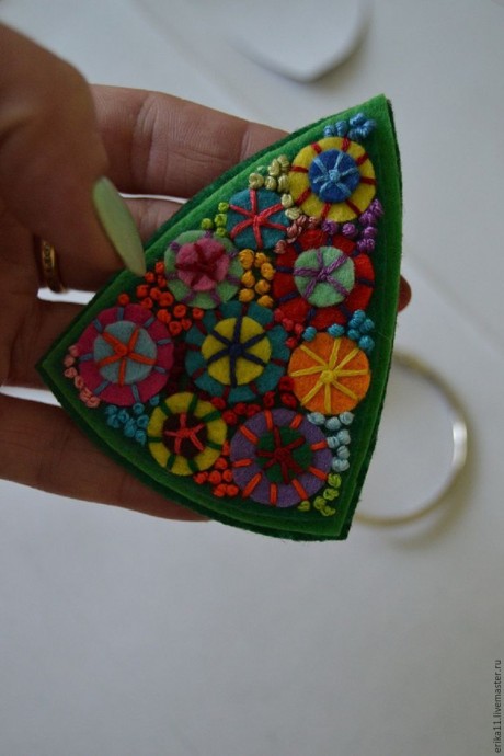 Весна уже не за горами, и всё больше хочется тепла и ярких красок. Сегодня я покажу вам процесс создания вот такой весенней брошки из фетра. Для того чтобы её сделать, не нужны особые навыки — достаточно уметь держать в руках иголку. Принцип составления узора на брошке очень прост. Достаточно включит всю свои фантазию и воплотить ее в брошке. Давайте же скорее приступим!