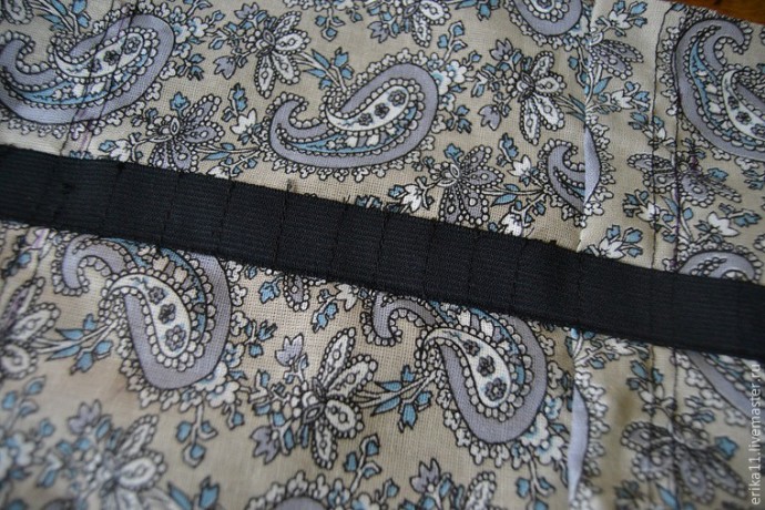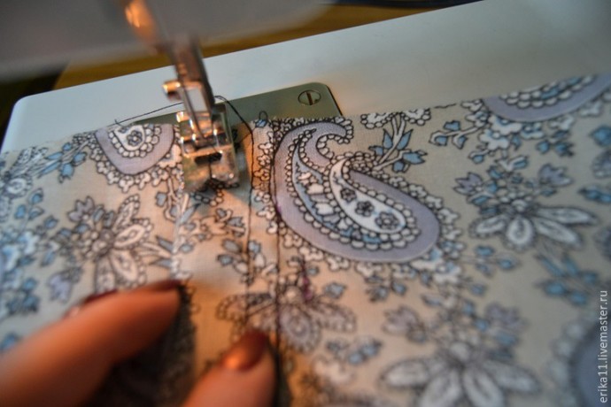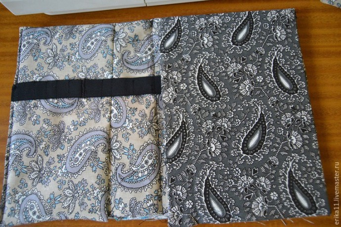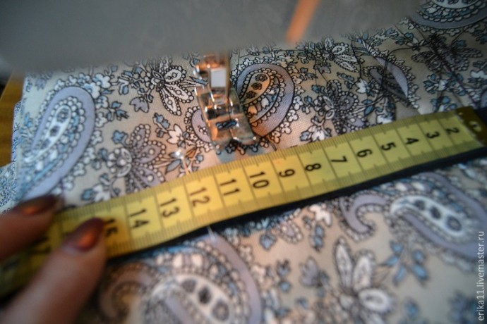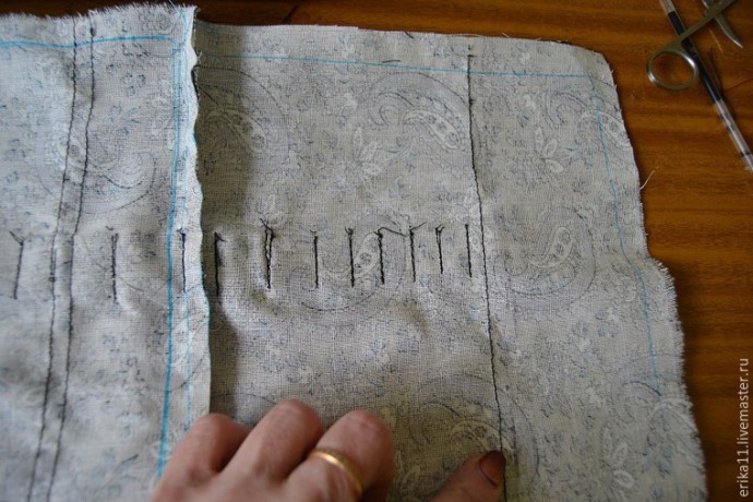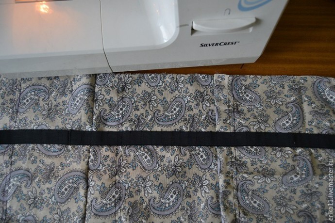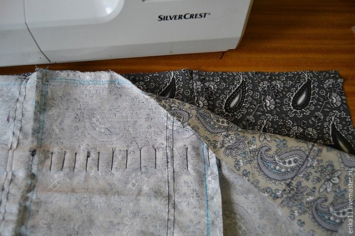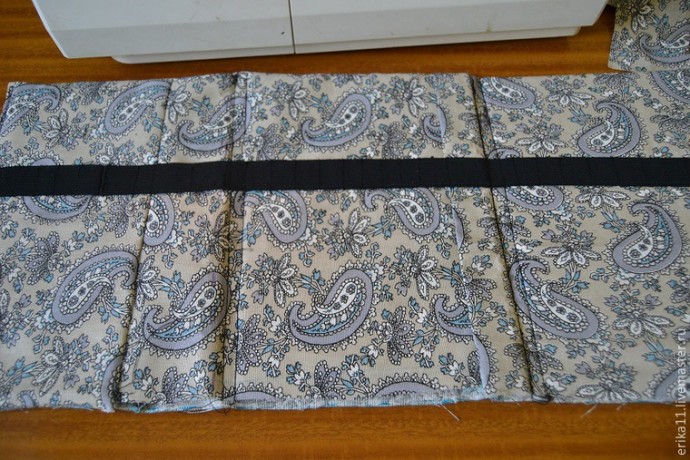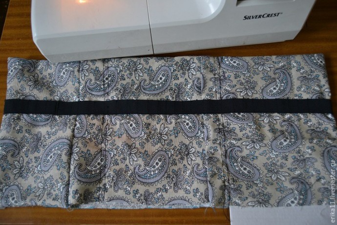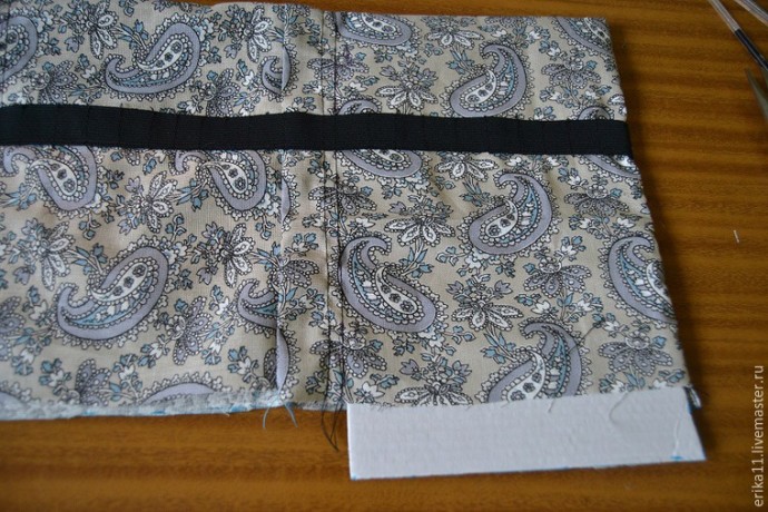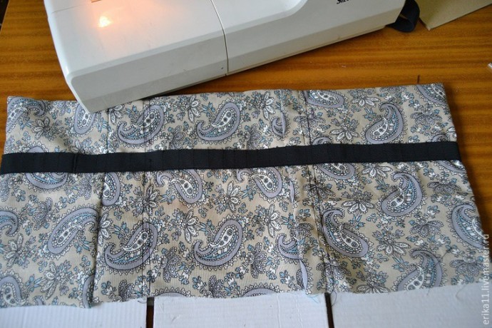 Я на момент прошивания делений сразу регулирую размер больших карманов для картона, то есть как только у меня прошито расстояние, соответстующее карману, в который мы потом будем вставлять картон, я сразу примеряю картон, оставляя по краям по 2 мм, для того чтобы картон смог потом легко войти в карман, и прошиваю ткань до конца. И тут же, оступив 0,5 см, я делаю еще один прошив до конца детали.