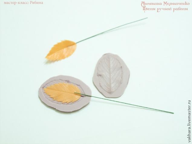 Зубчики нужно вырезать крайне быстро, не давая глине высохнуть на воздухе. Как только вы сформировали листик, воспользуйтесь текстурой для создания отпечатка. Я использую самодельные силиконовые молды, которые снимаются с настоящих листьев. Такая текстура выглядит более натурально. Если вы используете молды из стекло-пластика, их необходимо смазывать кремом перед использованием. Как только текстура готова, берем проволоку и смазываем где-то 1 см клеем. Аккуратно вдавливаем смазанный кусочек в нижнюю часть листика и защепляем края так, чтобы проволока немного просела вниз, спрятавшись, но при этом не прорвала глину. Даем листьям немного подсхонуть, укладывая на сушилку таким образом, чтобы придать им небольшие изгибы.
