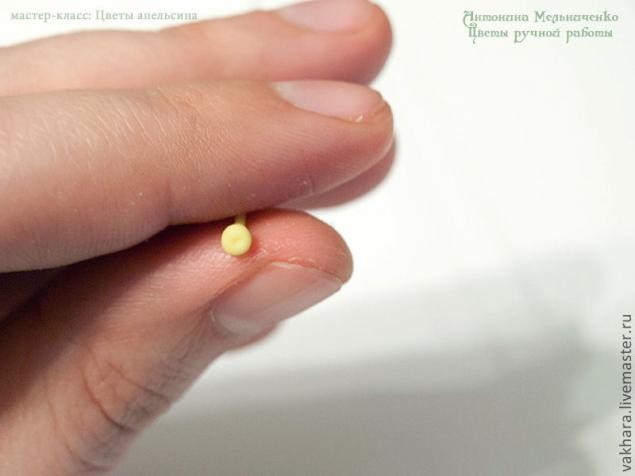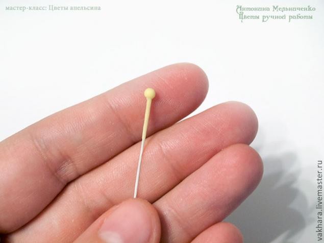 В цветах апельсина самое интересное и сложное – это пестик и тычинки. Сложность заключается в том, что если мы хотим добиться реалистичности, тычинки, в идеале, нужно делать так же из глины, так как у цветов апельсина они толстенькие и практически полностью закрывают собой, как забором, ножку пестика. Но в этом уроке мы будем использовать готовые нитчатые тычинки. Они придают цветочку, слепленному из глины, больше изящества. Начинаем мы с пестика. Цвет пестика у апельсина колеблется от белесого до ярко-желтого. Я решила взять нечто среднее, чтобы он потом не сливался с тычинками. Для начала я заготовила проволоку. На этот раз мы оставляем ее прямой и не делаем никаких петелек.
