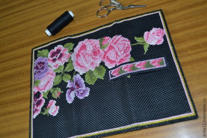 Берем нашу часть с вышивкой, вы видете на фото изнаночную часть моей вышивки, у меня она не идеальна, но в кошельке это роли не играет, так как изнанки видно не будет.