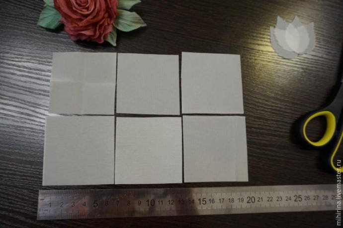 Можно сделать, конечно, выкройки и в полную величину, но такие сложности ни к чему :) Мы просто готовим квадраты из ткани, приблизительно ориентируясь на диагональную высоту лепестка. Тут, конечно, представлены не все квадраты, их должно быть еще 6 штук. Было желание разделить квадрат на 5 частей, чтобы получить 5 лепестков на каждом круге. Но тогда добавляется толщина и вырезать будет труднее.