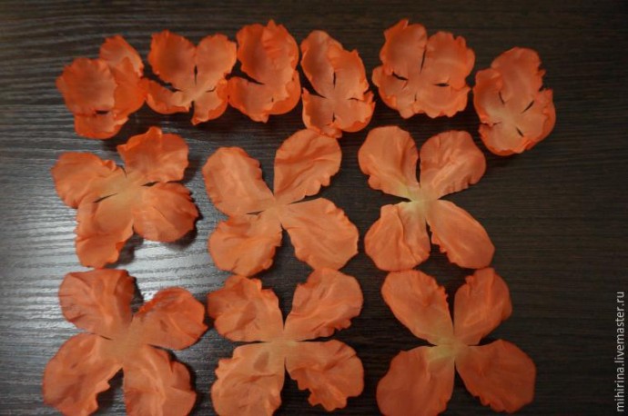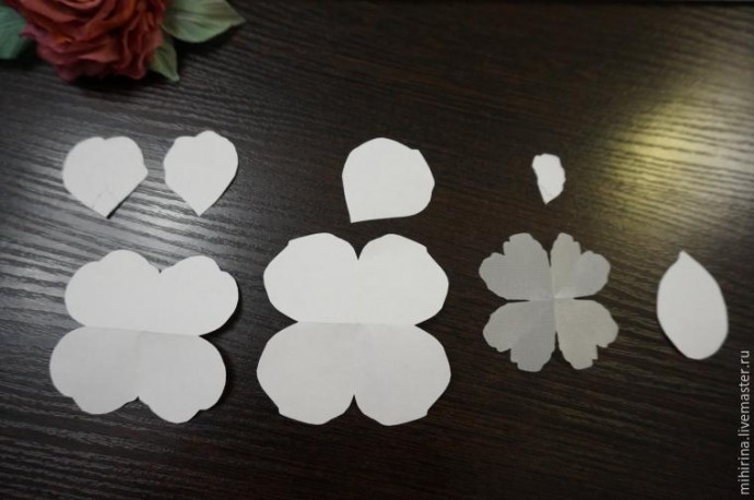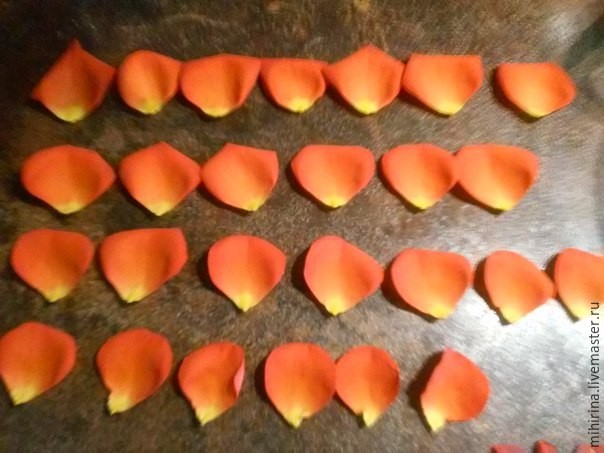 Переснятые лепестки. Каждый может сделать выкройки по розе самостоятельно, это не сложно. Единственное, дождитесь, когда они чуток подвянут, уже в разложенном виде, чтобы они немного потеряли свой объем. Кому понравились мои выкройки, пожалуйста, могу поделиться.