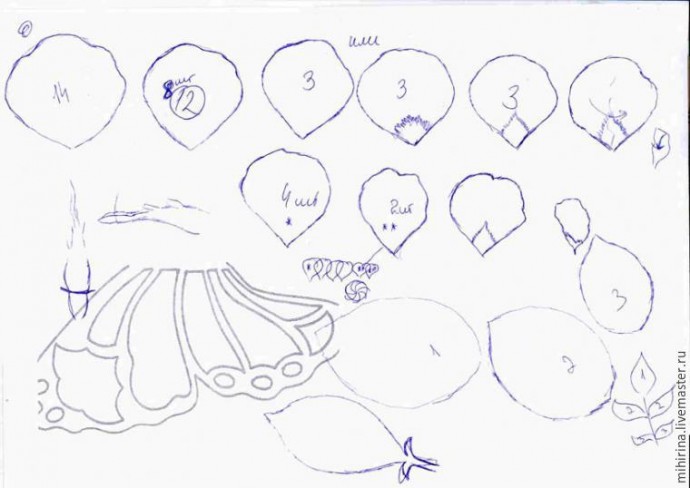 Итак, начнем. Вот наши выкройки. Из предложенных мной лепестков можно выбрать любые, которые понравятся вам по красоте и изгибам линий. Я взяла из второго ряда выкроек три подряд. Больших сделала 6 шт. по 4 лепестка в каждой выкройке, и маленьких по три каждой разновидности (итого получилось 2 вида по три штуки). Сердцевина получилась одна — выкройка из восьми лепестков, и 4 маленьких лепестка тоже для сердцевины. Плюс листики и подклейка (4 листика и 2 подклейки). Подклейка взята из выкроек цветов по коже. Листик самый маленький под №3 в моих набросках.