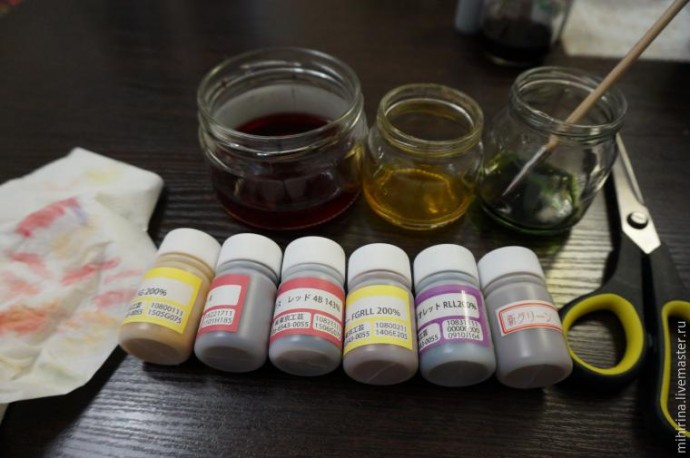 - краски (сухие японские), так же возможны краски Давыдова. Отличие красок в сроках годности и в способах нанесения. Японские — сухие, разводятся в воде, можно прокрашивать сухой материал, срок годности исчисляется годами. Краски Давыдова — срок годности ограничен — 9мес., наносяться на уже смоченные водой лекала;