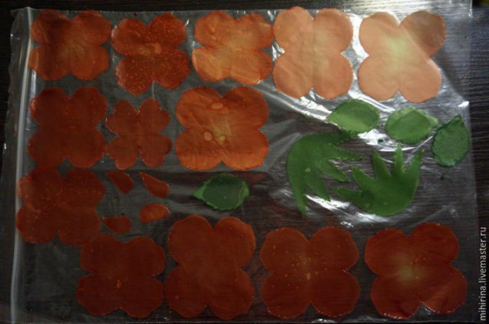 Вот эти краски смешивала для получения нужных цветов, по наитию, пока не пришла к нужному варианту. Самый крайний правый — это зеленый. Кисть промокала в салфеточку, чтобы видеть цвет. Не берите много воды. Для лепестков — 2-3 ст. л. воды, иначе раствор будет ненасыщенным. Для начала попробуйте 2 ст.л. воды. Я воды взяла многовато изначально, поэтому красила в два этапа, чтобы получить насыщенный цвет. Серединку прокрашивала немного желтым, но впоследствии она почти везде смазалась. Да, красить можно на обычной клеенке, лучше прозрачной, чтобы видеть цвет.