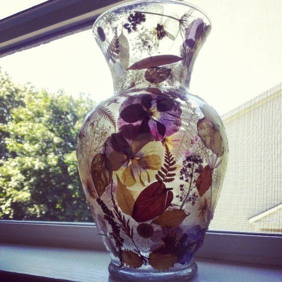 Вазы и бутылки для интерьера украшенные прессованными цветами