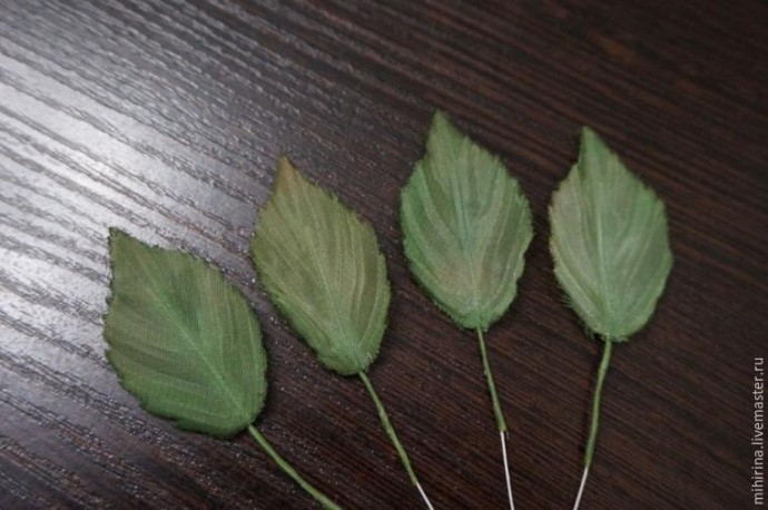 Далее берем нашу листву и приклеиваем к ней проволоку. Проволку с изнанки проклеиваем лентой усукиню (можно и полосочкой крепдешина 5 мм, окрашенной в цвет листвы). Проволоку также необходимо обмотать лентой в цвет листвы. Далее обрабатываем инструментом, я брала двойной нож. Прошлась по середине листочка, пропустив проволоку между лезвиями двойного ножа (от острия листка к ножке). Далее поочередно, то с лица, то с изнанки, проводила плавные линии двойным ножом. Подклейку так же обрабатывала двойным ножом, от острия к серединке, благодаря чему, подклейка приобрела красивую завивку