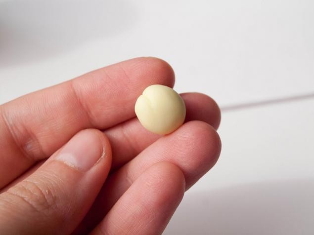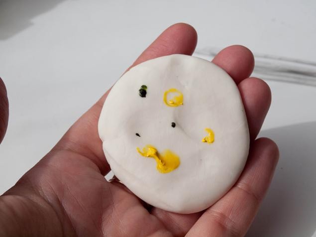 Пестики в тюльпанах бывают разных оттенков от зеленого до белого. Мы же будем делать светло-зеленоватый. И.. основной цвет у нас будет совсем не зеленый, а желтый. Берем в очень малых количествах краску, чтобы получить очень бледный цвет. Белый цвет глины мы используем, как основной цвет. Обратите внимание, как мало зеленого мы добавили. Но если этого не сделать, то цвет получится просто желтым.