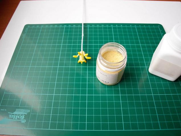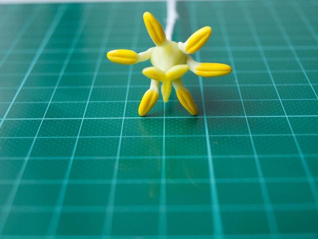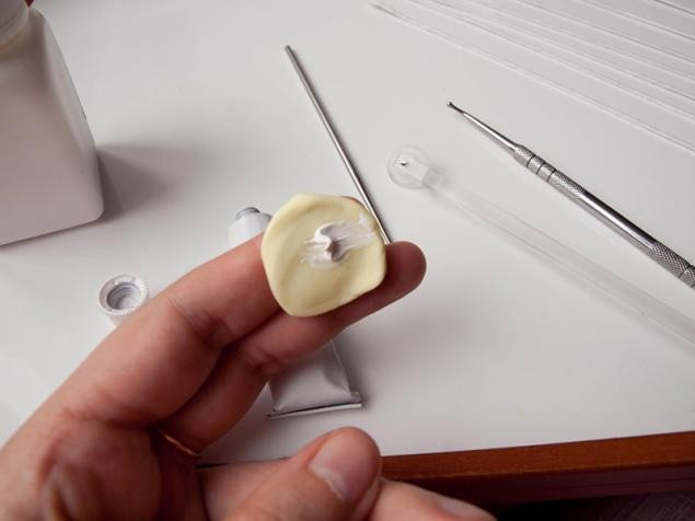 Серединка готова! Нужно добавить только тычинки. Берем уже замешанный нами ранее светло-зеленый цвет и добавляем в него белый. Это сделает цвет глины не только светлым, но и менее прозрачным.