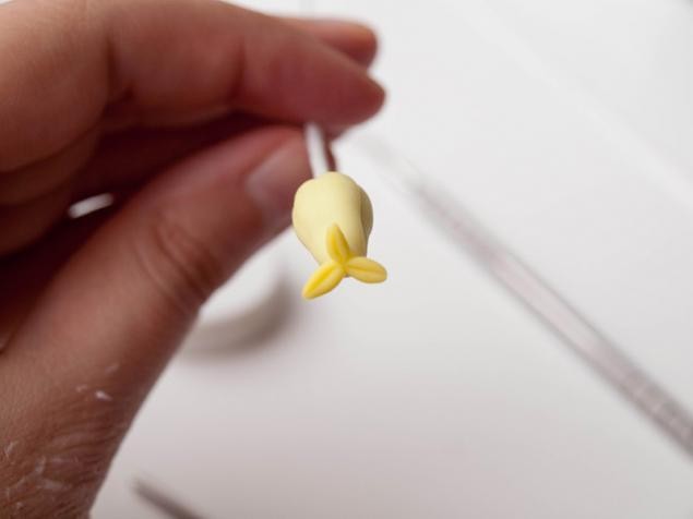 У тюльпана шесть тычинок, поэтому я отрываю сразу шесть одинаковых кусочков глины. Беру один, а остальные заворачиваю в пищевую пленку, чтобы не высохли.