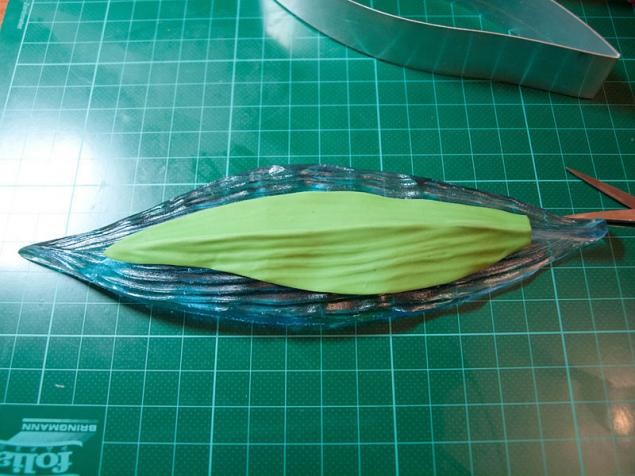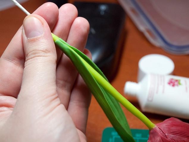 Наносим клей на низ листика и приклеиваем к нашей ножке. Примазываем при помощи воды, чтобы не было видно шва.