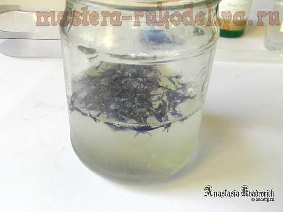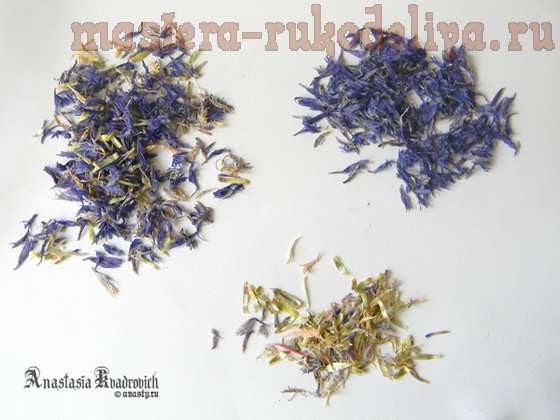 Теперь очередь сухоцветов. К сожалению, наши сухоцветы, продающиеся в магазинах с товарами для мыловарения не очень «чистые», в том смысле, что помимо самих цветков/лепестков мы покупаем ещё и кучу стебельков и прочих ошмётков, которые в мыле будут коричневеть, колоться и портить внешний вид. Так что старательно выбираем именно лепестки вальков, которые и пойдут в само мыло. Вообще, мало какая растительность в мыле хороша, потому как в большинстве случаев вся эта красота буквально через несколько дней станет коричнево-грязной, испортив всё мыло. В мыле не чернеют только лепестки календулы, цветочки жасмина (который для чая продаётся) и цветы лаванды. Даже наши васильки, со временем, обесцветятся, оставив после себя только структуру листа (не переживайте, всё-равно будет красиво и необычно смотреться).