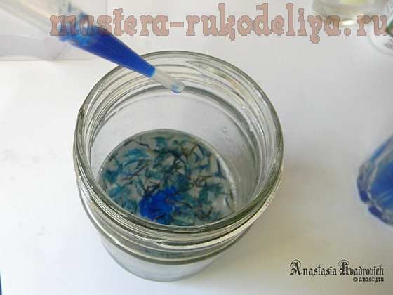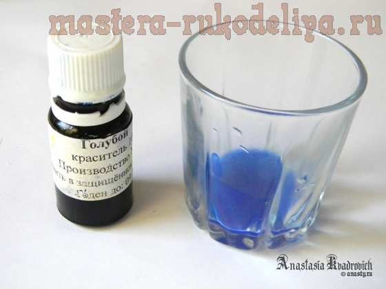 Когда форма готова, приступаем к красителям. Как сухие, так и жидкие красители я всегда предварительно развожу в дист. воде, спирте или глицерине, а потом уже по капле добавляю. Добавлять краситель непосредственно в основу чревато перебором в цвете, поскольку красители очень концентрированные, а дозаторы не всегда точные (иногда вместо капли можно случайно добавить 10 капель).