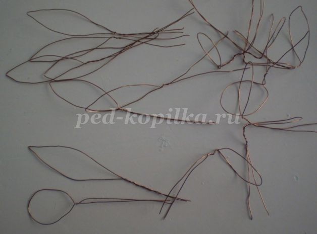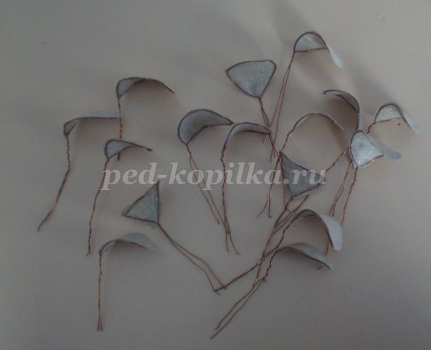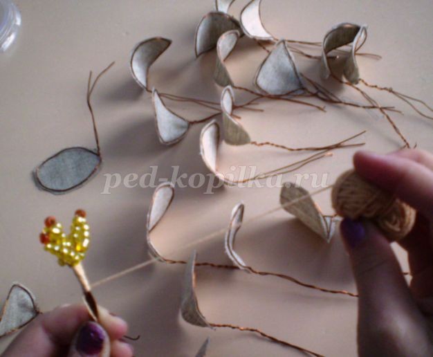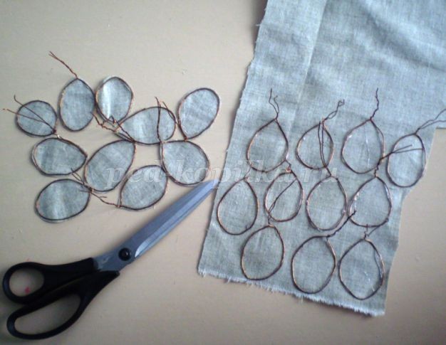3. На продолговатый и круглый проволочный контур наносим клей, приклеиваем к мешковине все листья, даем хорошенько высохнуть. Вырезаем листья острыми ножницами.