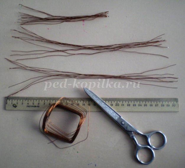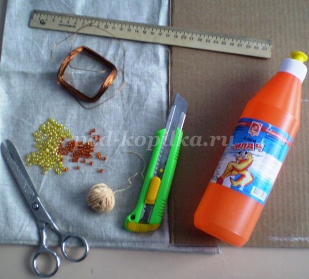 Материалы и инструменты: мешковина, картон коробочный, линейка, проволока для плетения бисером, ножницы, карандаш простой, бисер крупный (желтого и оранжевого цвета), нож канцелярский, клей «Силач», нитки №10 бежевого цвета.