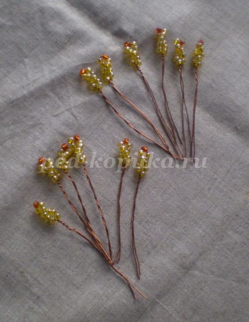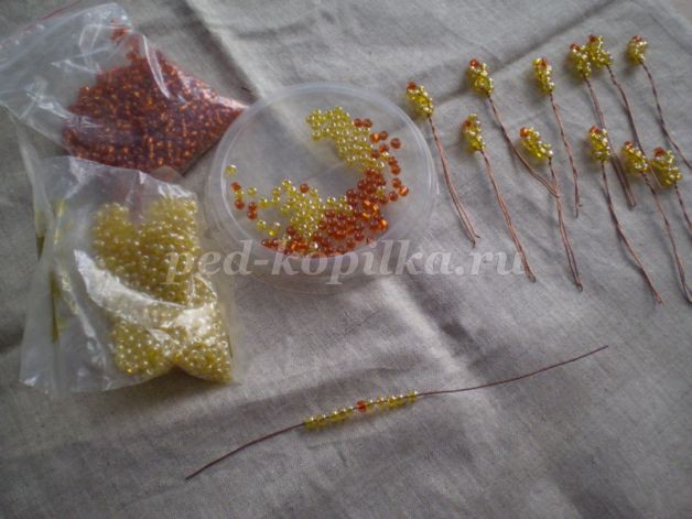 4. На проволочку длиной 15 см. набираем крупный бисер (5 желтого цвета, 1 оранжевого цвета, 5 желтого цвета). Складываем концы проволочки пополам, скручиваем. Полученную петельку перекручиваем еще раз.