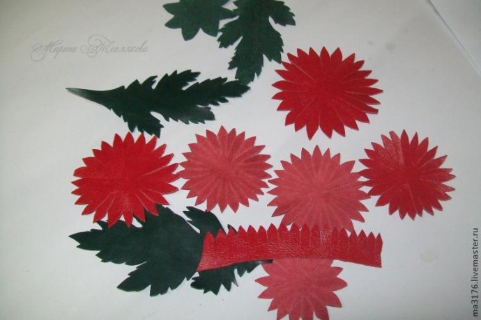 Я взяла полоску желтой кожи шириной 2 см,длиной 10 см. Склеила пополам и нарезала как на фото.