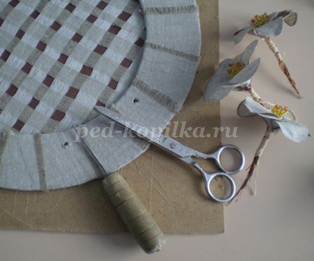 14. Шилом прокалываем картонный круг для установки цветов и листьев, расширяем дырочки ножницами.