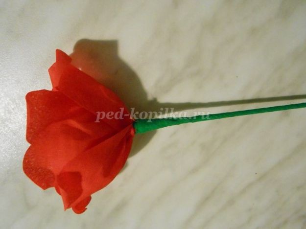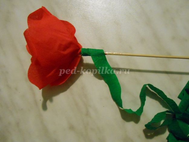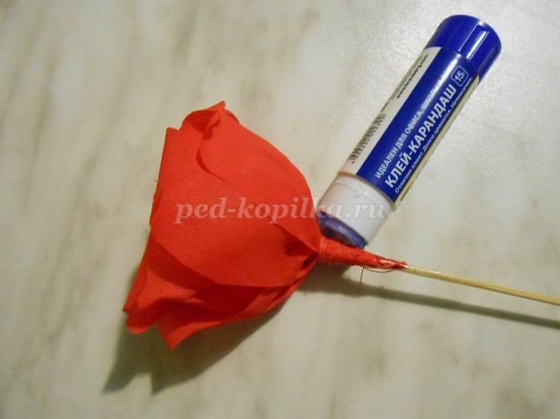 Внизу полоску закрепляем при помощи клея. Роза готова! Нам понадобится 9 красных роз и 6 белых.