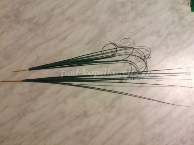 Осоку прикрепляем скотчем к шпажкам. Завиваем ее при помощи ножниц.