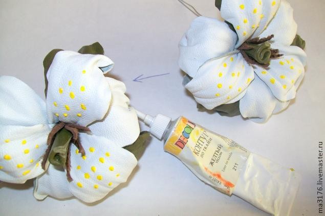 Берем контур и на 3 лепестках делаем крапины, у меня оказался под рукой желтый.