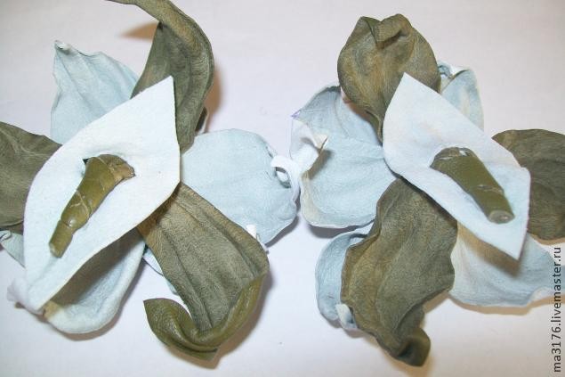 Лепестки почти сухие, но еще легко можно их растянуть. Сначала по центру в ширину потянуть,потом потянуть вдоль вокруг пальца, чтобы форма осталась полукруглой, как на фото. Теперь уже сушим до готовности. Можно сушить в духовке разогретой с открытой дверкой или феном.