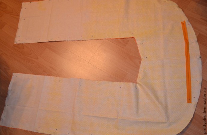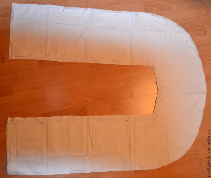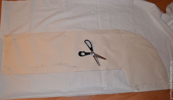 Далее вырезаем выкройку и прикалываем ее на ткань, сложенную вдвое лицом к лицу.