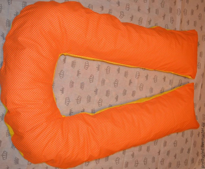 Вот такая деталь у нас получилась. Их должно быть 2 штуки. Складываем ткани лицом к лицу и скалываем булавками. На верхней части делаем две пометки на расстоянии друг от друга 30 см. Через это отверстие мы будем выворачивать изделие и наполнять холлофайбером. Прошиваем по периметру. По периметру, не доходя 2 мм до шва, делаем ножницами насечки, особенное внимание уделяя углам и округлым местам (либо вырезать ткань ножницами-зигзаг). Выворачиваем и наполняем холлофайбером. После того, как подушка наполнена (степень наполнения регулируем сами), можно зашивать отверстие вручную потайным швом. Наша подушка готова.