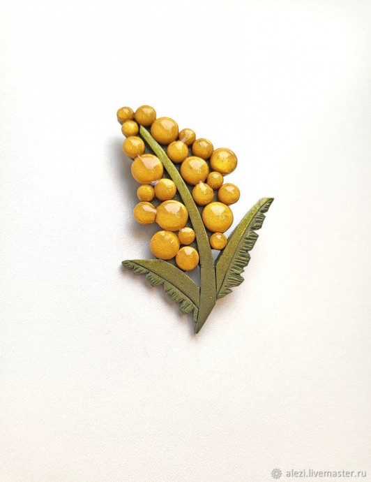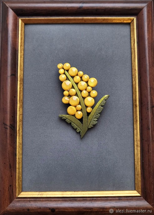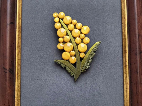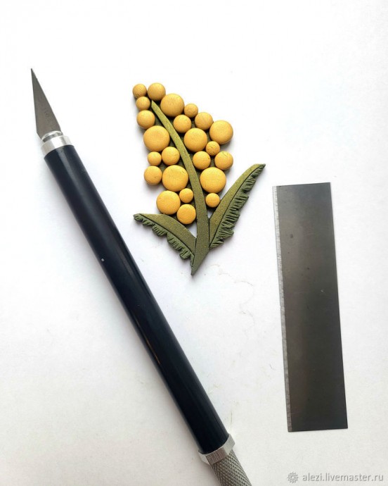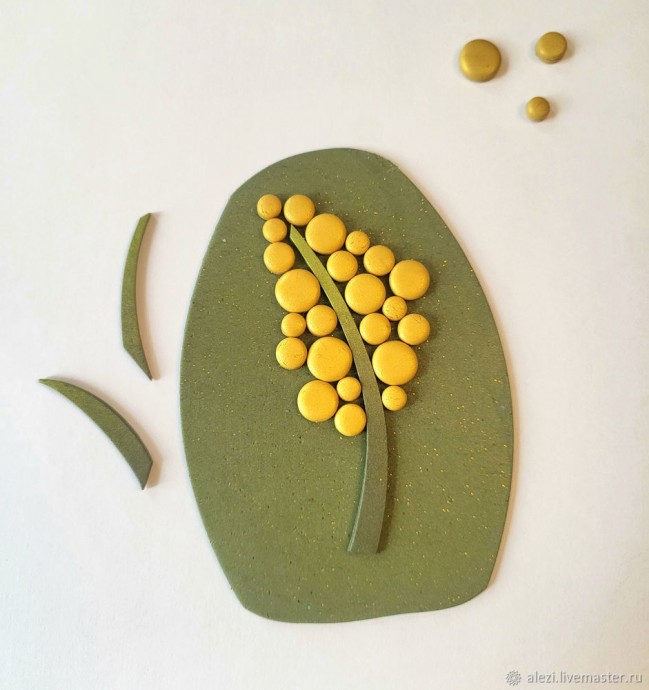 Раскатываем пласт (он должен быть существенно тоньше золотистого) и лезвием вырезаем тонкий стебель. Подготавливаем подложку из подходящей глины и начинаем выкладывать мимозу.