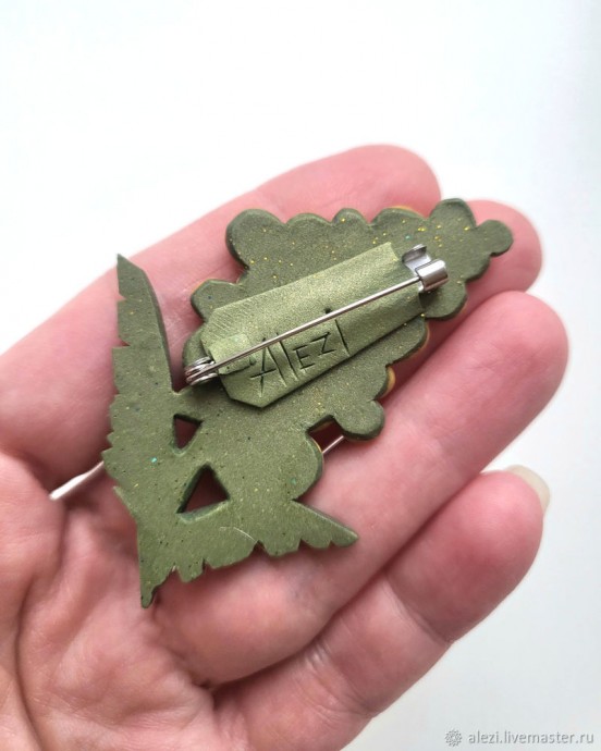 Подравняв все края, отправляем запекаться на 30 минут. После запекания и остывания сажаем на клей булавку (я использую булавки из хирургической стали, так как они не темнеют и не ржавеют). Прикрываем булавку полимерной глиной (мне не хотелось утяжелять изделие, поэтому прикрыла не по периметру, а только основание булавки) и опять запекаем.