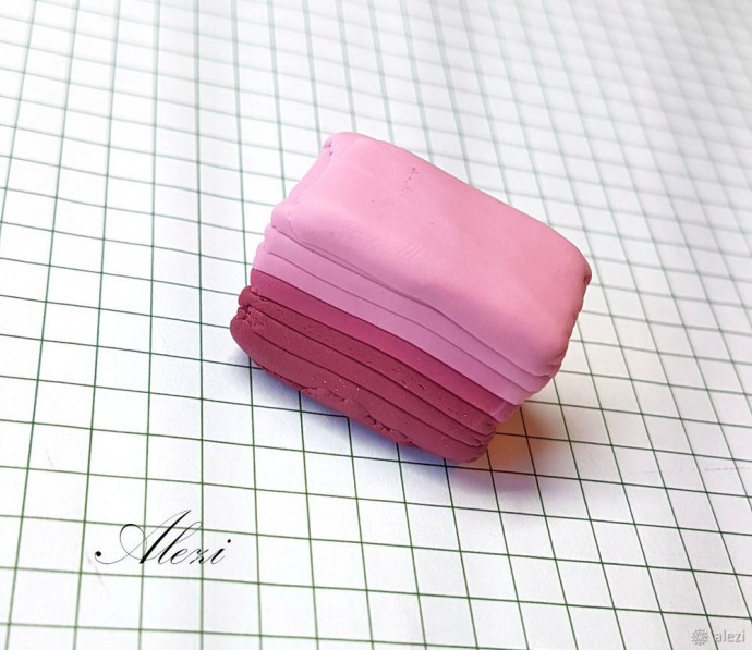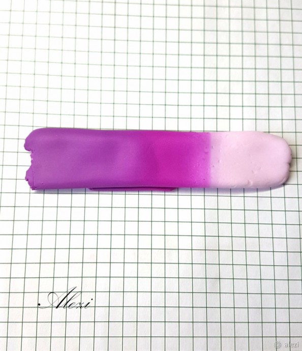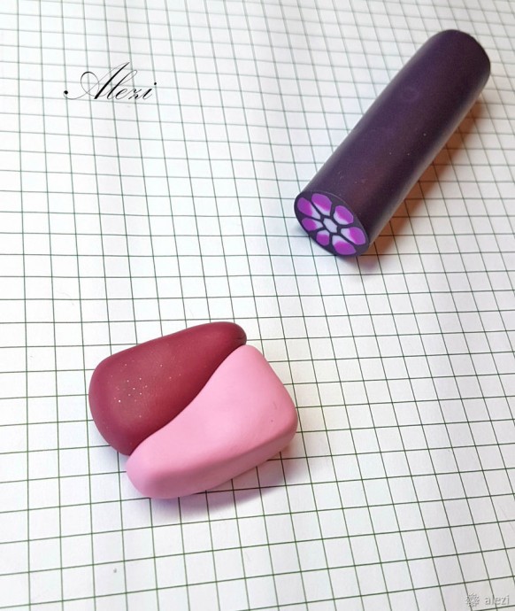 Раскатываем и нарезаем на равные части. Пара колбасок должна быть чуть меньшего размера. Плюс дополнительно делаем колбаску из бледно-розовой полимерной глины, завернутой в темно-фиолетовую. Это будет середина цветочка.
