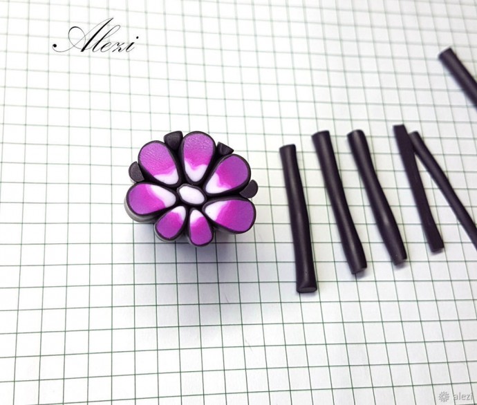 Придаем им форму лепестка и собираем цветок. Пространство между лепестками также прокладываем полимерной глиной темно-фиолетового цвета.