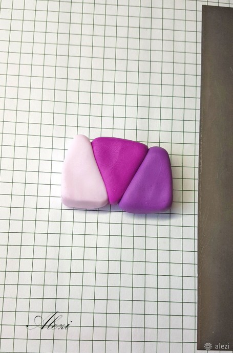 Итак, делаем первую трость. Берем три кусочка полимерной глины — вишня, фиолетовый и полупрозрачный бледно-розовый.